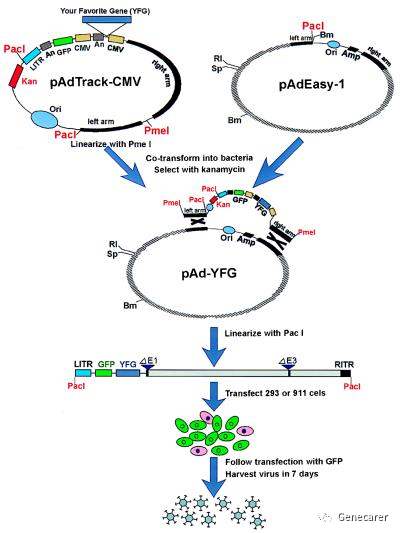 第三步:pShuttle-CMV和pAdEasy-1共同转化大肠杆菌BJ5183,双质粒在BJ5183中发生重组,卡那霉素筛选重组子,并酶切鉴定。因为BJ5183有recA重组酶活性但同时又缺失介导细菌本身基因组重组的酶,可以用于质粒重组和转化,得到候选重组子;