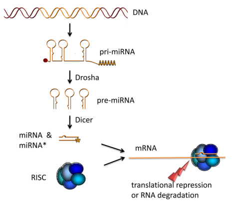 RNA酶IIIDrosha-DGCR复合体首先在细胞核中将miRNA原代初转录产物(pri-mRNA)基部切割双链形成60-70个核苷酸的3C末端具有二核苷酸突出(Over-hang),5C末端具有磷酸基的茎环中间体,即前体miRNA(Pre-miRNA)。然后,通过识别pre-miRNA的3C端的二核苷酸突出信号,转运蛋白Exportin-5与pre-miRNA结合,将pre-miRNA通过依赖Ran-GTP途径运输至细胞质。最后,Dicer识别pre-miRNA双链的3C末端突出以及5C末端磷酸,切断距茎环大约2个螺旋转角的螺旋体的双链,其产物结构类似于siRNA的二聚体,其中pre-miRNA的一条臂产生一个长度与miRNA相同的片段,即miRNA,而成熟的miRNA来自于pre-miRNA的另一条臂。在经过核质转运及切割后,RNA解螺旋酶作用于miRNA:miRNA二聚体,其中miRNA被降解,miRNA则进入RNA诱导的沉默复合物(RISC)中发挥作用。
