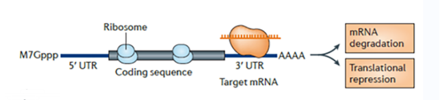 哺乳动物中,靶序列通常于mRNA的3’UTR互补结合,并根据互补程度的不同指导沉默复合体降解靶mRNA或者阻遏靶mRNA的翻译。