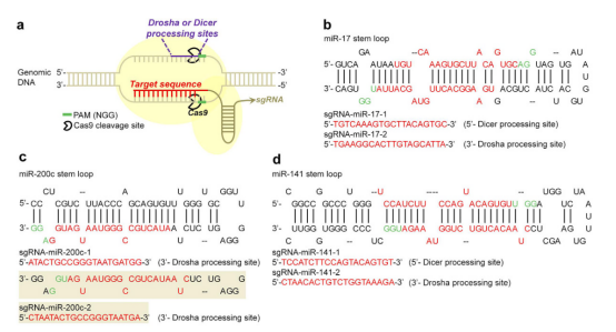 图a:CRISPR/Cas9 敲低miRNA作用原理 图b-d miR-17 miR-200c miR-141 sgRNA设计