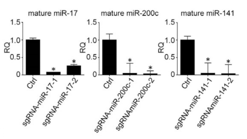 Hong Chang等通过CRISPR/Cas9对miR-17、miR-200c 和 miR-141 进行敲低,均实现了目的miRNA不同程度的敲低。