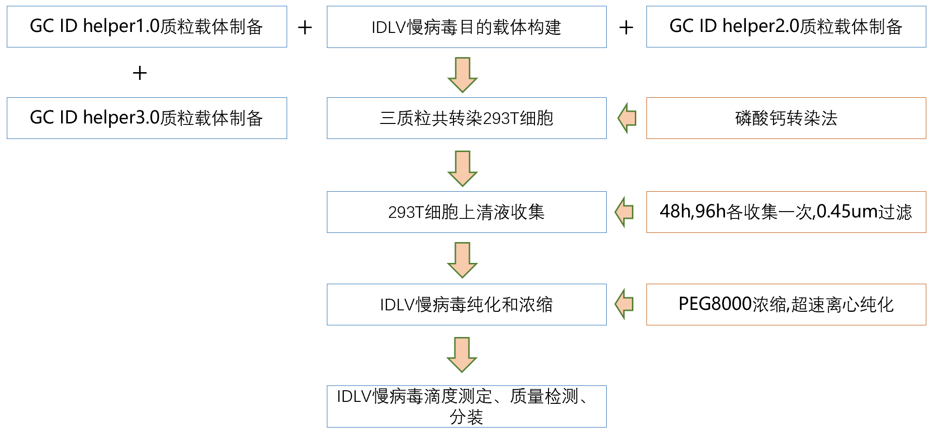 GC-Lenti-ID非整合慢病毒包装系统属于第三代的包装系统,将慢病毒的反式作用原件gag、pol,env等基因用辅助质粒表达(GC ID helper1.0)表达,表达水泡性口腔炎病毒(VSV)糖蛋白(G)的包膜蛋白载体(GC ID helper2.0),表达突变gag质粒载体(GC ID helper3.0)四质粒共转染HEK -293T细胞,收集病毒,病毒浓缩纯化,病毒滴度测定和质量检测,四质粒系统能大大降低复制病毒的可能性,生物安全性进一步提高。