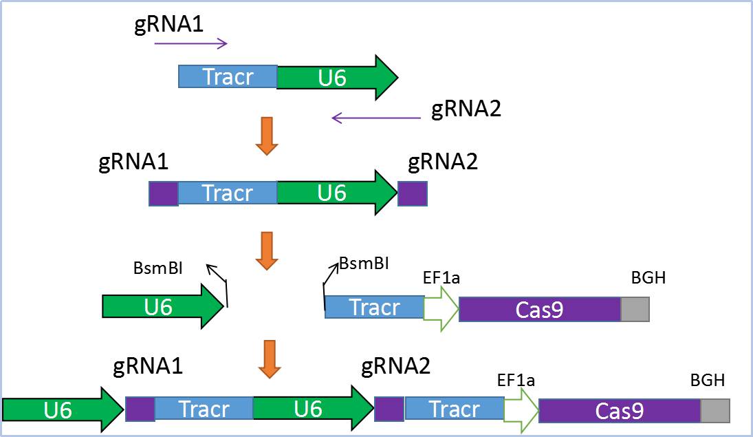 在单gRNA/Cas9表达系统的基础上,再引入一个gRNA-Scaffold的表达盒,使其能够同时表达两个不同的gRNA靶向两个不同的序列。因此,针对目的基因的敲除,可设计针对该基因的两个不同靶点,这两个靶点之间的编码序列可以通过CRISPR/Cas-NHEJ通路完全敲除。