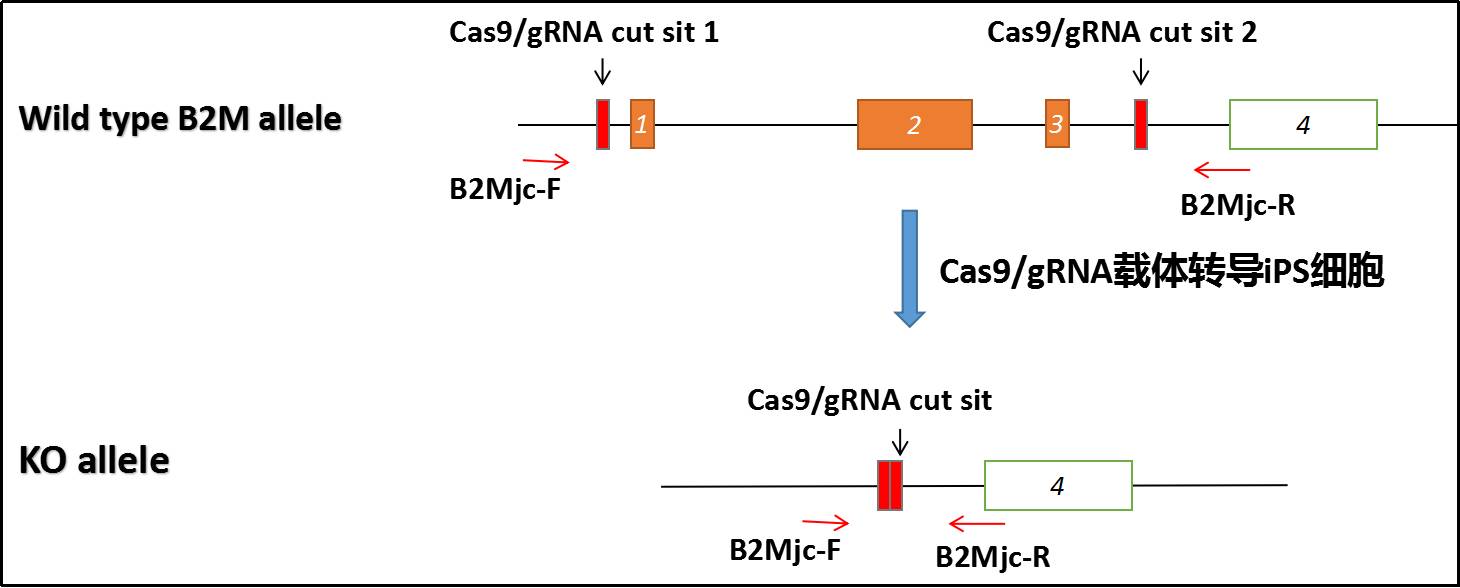 B2M基因有4个外显子,其中前3个外显子为编码序列,故在第一个外显子上游和第三个外显子下游设计gRNA序列,基因型PCR检测引物设计在两个gRNA序列的外侧如下图所示: