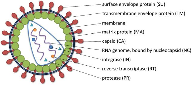 HIV-1是研究最深入和改造使用最充分的慢病毒。HIV的单链RNA基因组长度约为9 kb,包括三个主要结构基因:gag,pol和env。gag基因转录成未剪切mRNA, 然后切割成编码病毒的核心蛋白包括衣壳蛋白(CA/p24),主要作用是通过包被病毒颗粒中的病毒RNA并与之紧密结合来保护病毒基因组、内膜蛋白(MA/p17),为病毒体组装和感染非分裂细胞所必须、和核衣壳蛋白(p7),通过包被病毒颗粒中的病毒RNA并与之紧密结合来保护病毒基因组;pol基因编码病毒复制相关的酶;env基因编码病毒包膜糖蛋白。此外,病毒基因组还编码两个调节蛋白,即tat、rev,rev主要参与蛋白调节的表达水平,tat参与蛋白转录的控制,与病毒的长末端重复序列(long terminal repeats, LTRS)结合后促进病毒的所有基因的转录。以及四个辅助蛋白,即vif、vpr、vpu、nef。两端两个LTR位于病毒基因组的侧面,是病毒转录、逆转录和病毒基因组整合所必须的,ψ基因位于5'-LTR和gag基因之间,是基因组二聚化和包装的必须信号。