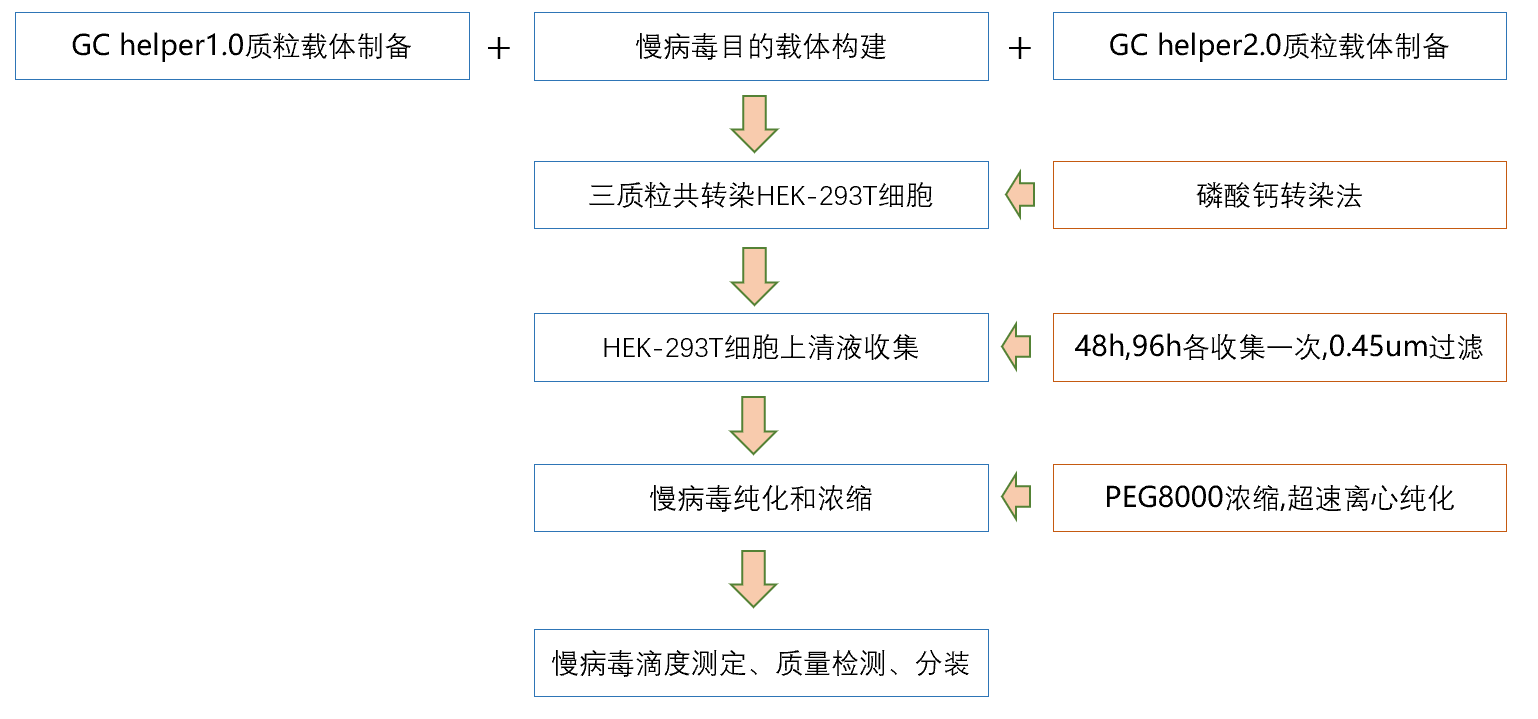 重组慢病毒载体是在慢病毒基因特性的基础上,表达载体保留病毒复制,整合、包装所必须的必须顺式作用原件(LTRs,ψ等),同时表达目的基因(cDNA,shRNA或miRNA);出于生物安全性考虑,将慢病毒的反式作用原件gap、pol,env等基因用辅助质粒表达(GC helper1)表达,表达水泡性口腔炎病毒(VSV)糖蛋白(G)的包膜蛋白载体((GC helper2),三质粒共转染HEK-293T细胞,收集病毒,病毒浓缩纯化,病毒滴度测定和质量检测。