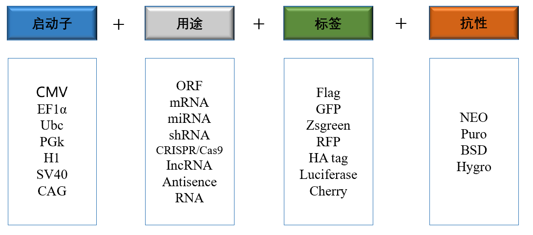 基恩科生物(GeneCarer)提供各种慢病毒载体可供选择,不同启动子,不同筛选标记,不同蛋白标签。