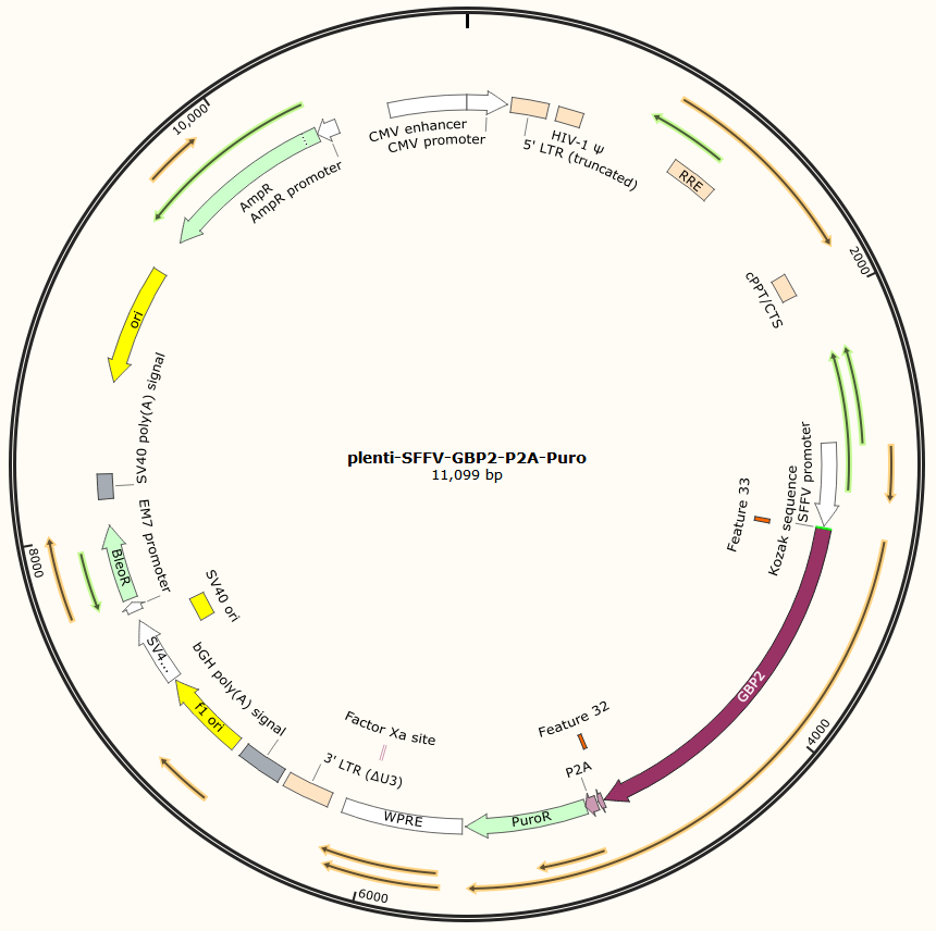 plenti-SFFV-GBP2-P2A-Puro是以基恩科生物自研慢病毒骨架载体pLenti-SFFV-MCS-Puro为骨架载体构建,过表达人GBP2基因,与载体PMD2.G和Pspax2配套进行慢病毒包装。