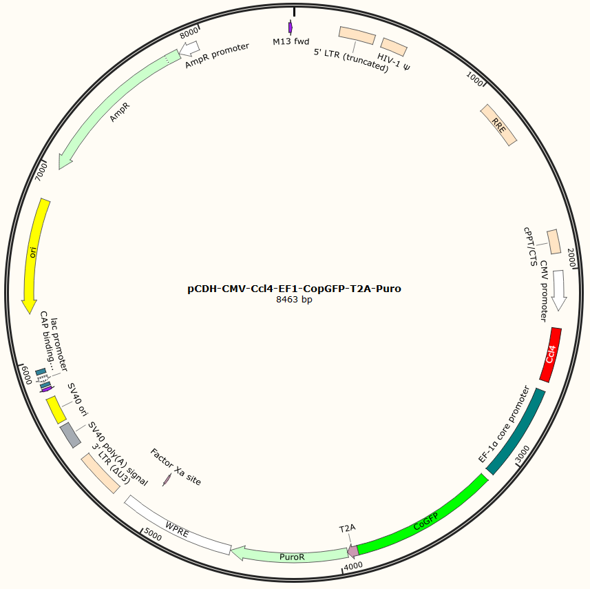 pCDH-CMV-Ccl4-EF1-CopGFP-T2A-Puro是以基恩科生物自研慢病毒骨架载体pCDH-CMV-MCS-EF1-CopGFP-T2A-Puro为骨架载体构建,过表达小鼠Ccl4基因,与载体PMD2.G和Pspax2配套进行慢病毒包装。