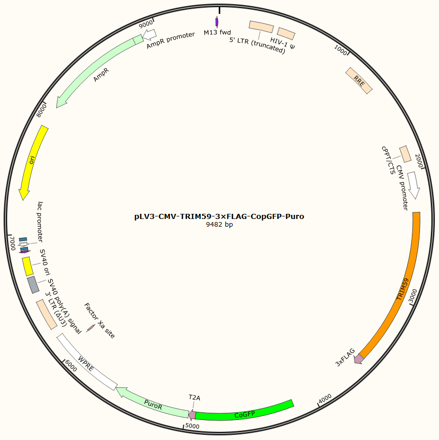 | GC020400992 | pLV3-CMV-TRIM59-3×FLAG-CopGFP-Puro | 2μg | TRIM59基因过表达 | 800.00 | 2-3天 |