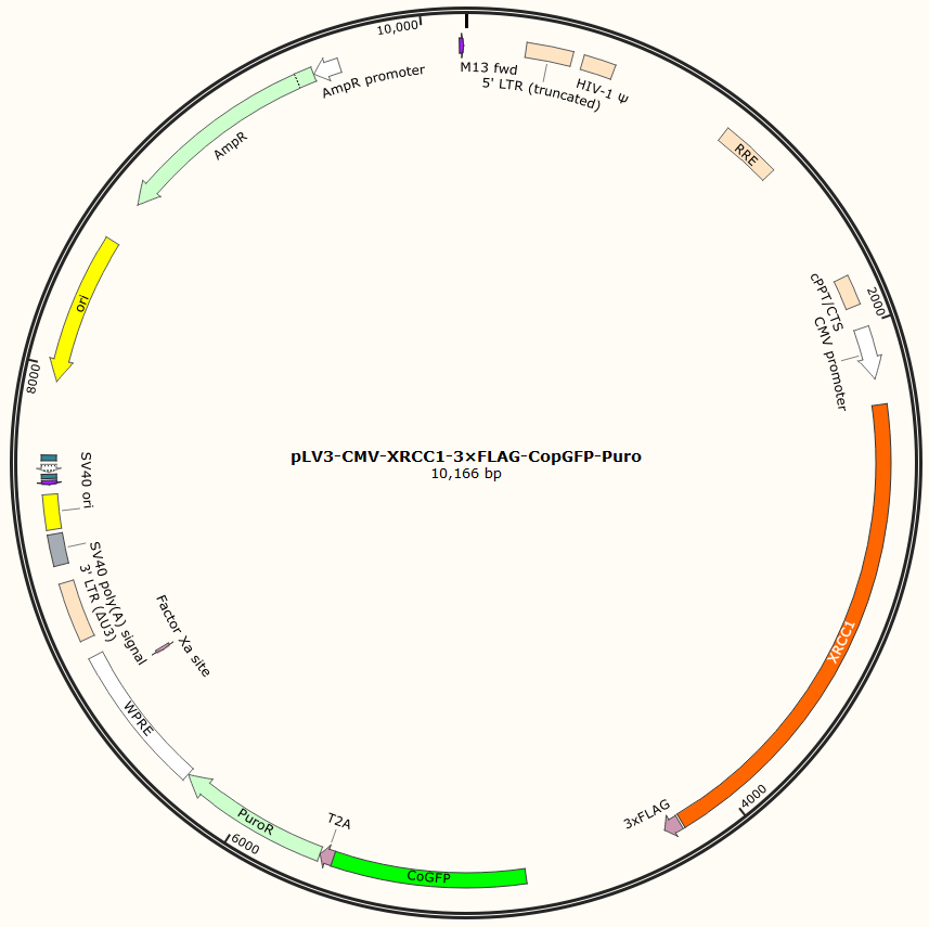 pLV3-CMV-XRCC1-3×FLAG-CopGFP-Puro是以基恩科生物自研慢病毒骨架载体pLV3-CMV-MCS-3×FLAG-CopGFP-Puro为骨架载体构建,过表达小鼠XRCC1基因,与载体PMD2.G和Pspax2配套进行慢病毒包装。