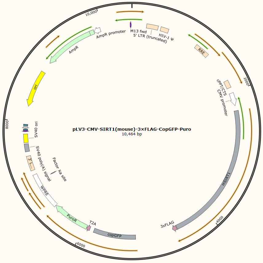 pLV3-CMV-SIRT1(mouse)-3×FLAG-CopGFP-Puro是以基恩科生物自研慢病毒骨架载体pLV3-CMV-MCS-3×FLAG-CopGFP-Puro为骨架载体构建,过表达小鼠SIRT1基因,与载体PMD2.G和Pspax2配套进行慢病毒包装。