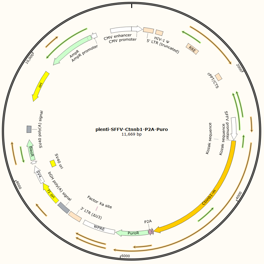 plenti-SFFV-Ctnnb1-P2A-Puro是以基恩科生物自研慢病毒骨架载体Lenti-SFFV-MCS-Puro为骨架载体构建,过表达小鼠Ctnnb1基因,与载体PMD2.G和Pspax2配套进行慢病毒包装。