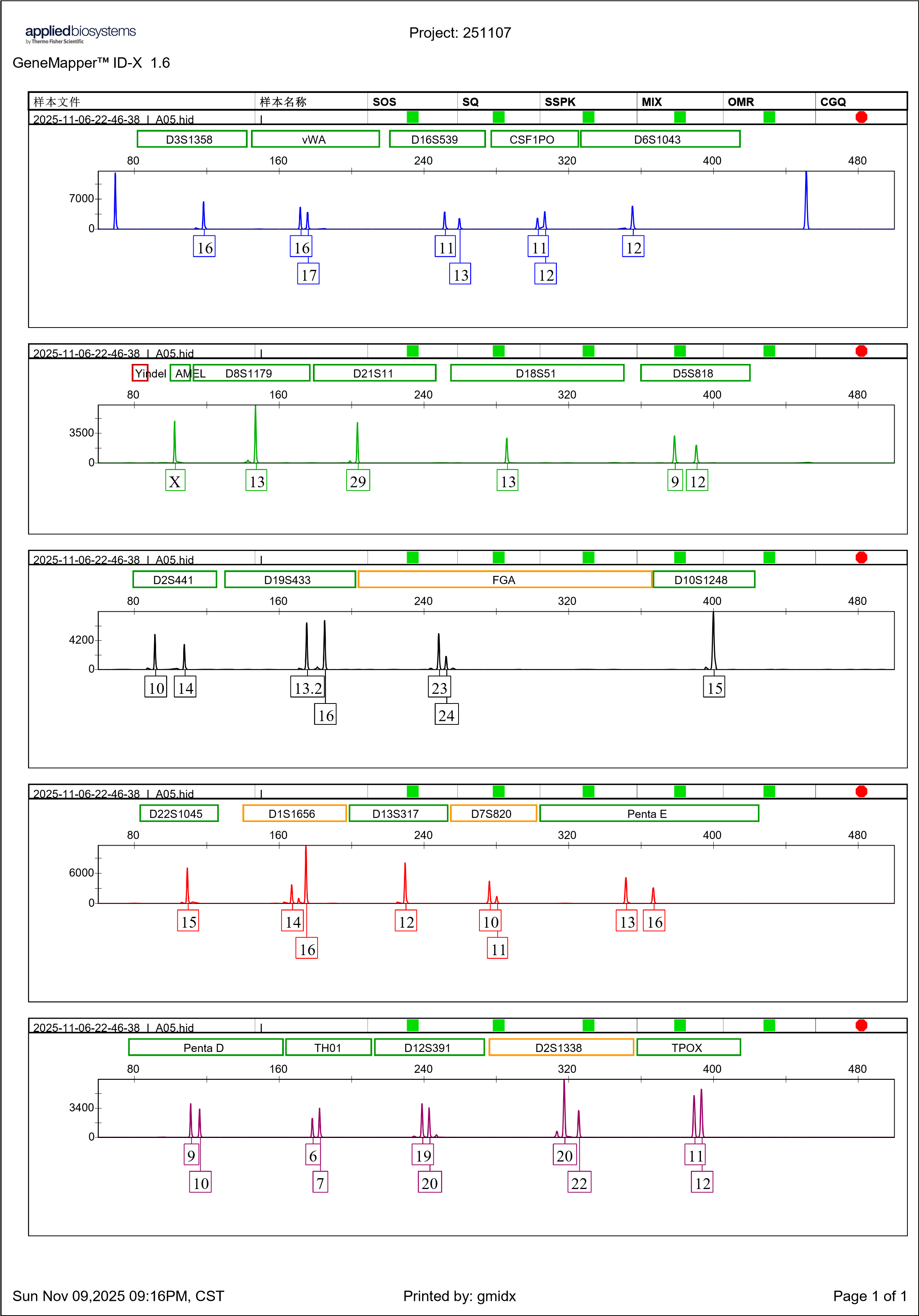 取适量的AGS细胞,用Axygen的基因组抽提试剂盒提取DNA,采用VeriFilerTM Plus PCR Reagents扩增试剂盒扩增,在ABI 3500XL型遗传分析仪上对STR位点和性别基因Amelogenin进行检测。
