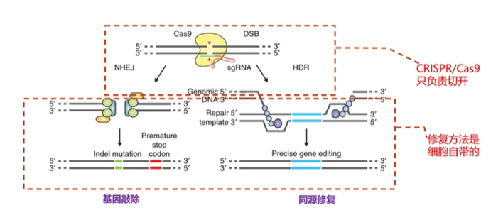 每个复合物都由CAS9蛋白、tracrRNA和gRNA组成。这些结构中的crRNA识别并引导CAS9切开病毒DNA。科学家们通过模仿tracrRNA和crRNA的单个RNA分子(gRNA)使用CRISPR-CAS9系统。例如当俩个这样的引导RNA被引入到CAS9的细胞中并且都针对相同的基因时一个序列可以被切除,一旦这个目标区域被移除,切断的末端会发生非同源末端连接(NHEJ)修复或者同源定向修复(HDR)。