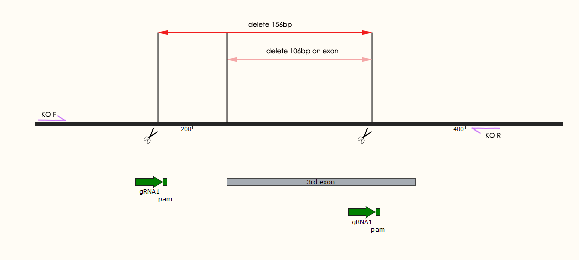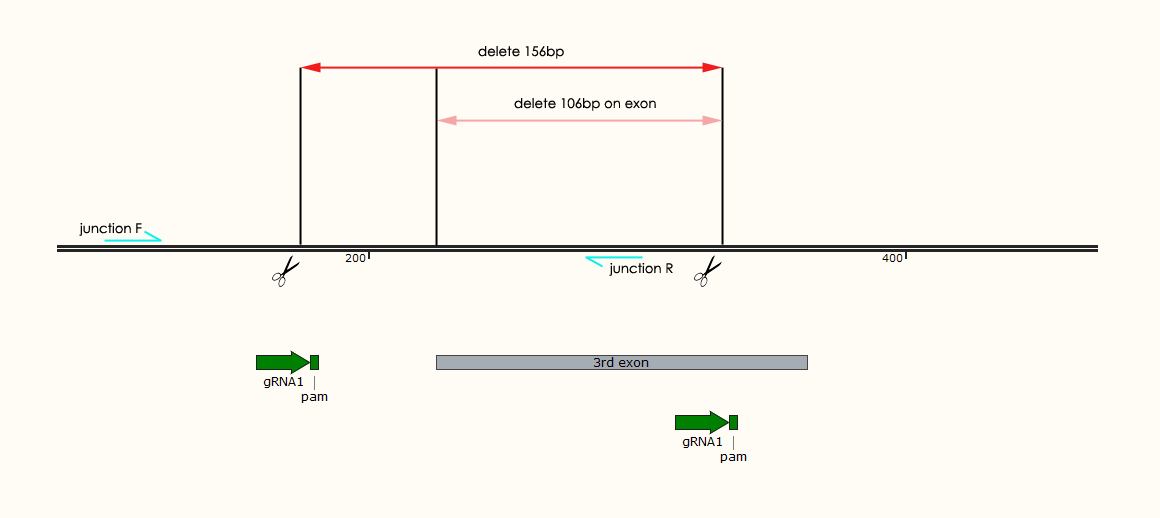 如上图所示,A基因敲除大小为156 bp,外显子敲除106 bp。