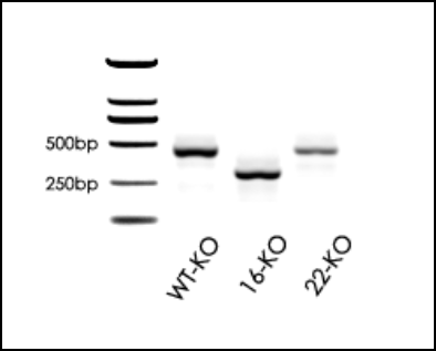 结合KO引物PCR扩增产物琼脂糖凝胶电泳结果判断,16号单克隆细胞株KO引物PCR扩增产物略大于250bp marker,符合敲除后270 bp PCR扩增产物大小,下一步可进行胶回收送测序,进一步确定其基因型。
