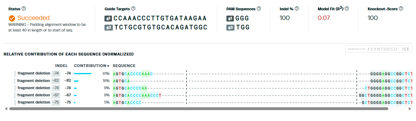 2.精确的片段敲除:敲除的细胞株在切割位点发生精确切割且无indels引入,也无同源定向修复(HDR),最终基因组切割片段与设计的切割片段完全吻合。