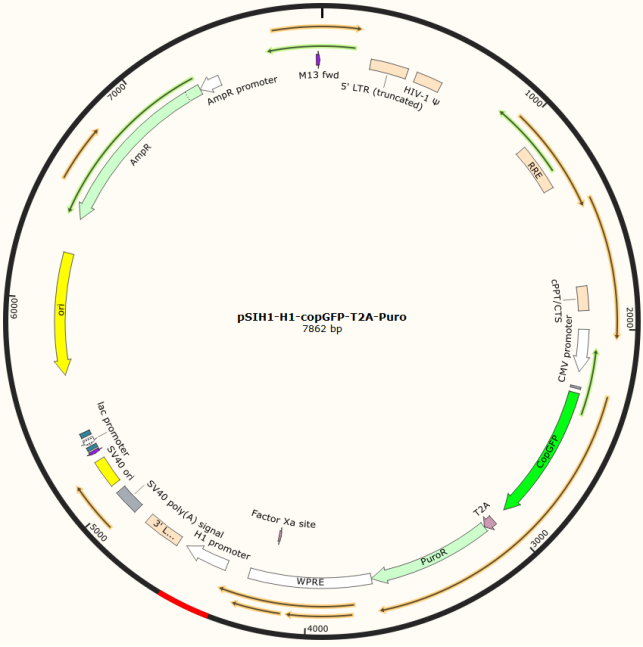pSIH1-H1-copGFP-T2A-Puro慢病毒表达载体,可以用于瞬转或慢病毒包装;含H1-promoter用于表达shRNA序列;带有GFP和Puro双标签,可用于检测转染效率和抗性筛选。