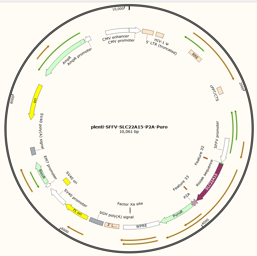 plenti-SFFV-SLC22A15-P2A-Puro是以基恩科生物自研慢病毒骨架载体PLenti-SFFV-MCS-Puro为骨架载体构建,过表达人SLC22A15基因,与载体PMD2.G和Pspax2配套进行慢病毒包装。