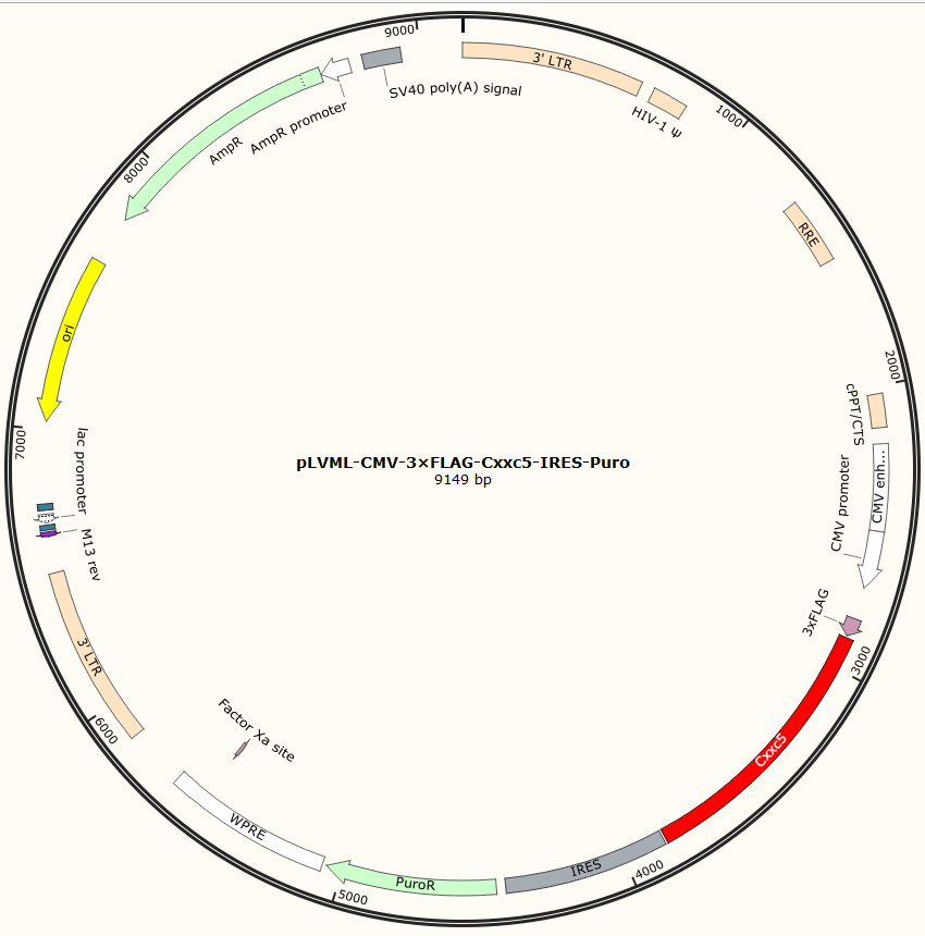 pLVML-CMV-3×FLAG-Cxxc5-IRES-Puro是以基恩科生物自研慢病毒骨架载体pLVML-CMV-3×FLAG-MCS-IRES-Puro为骨架载体构建,过表达小鼠Cxxc5基因,与载体PMD2.G和Pspax2配套进行慢病毒包装。