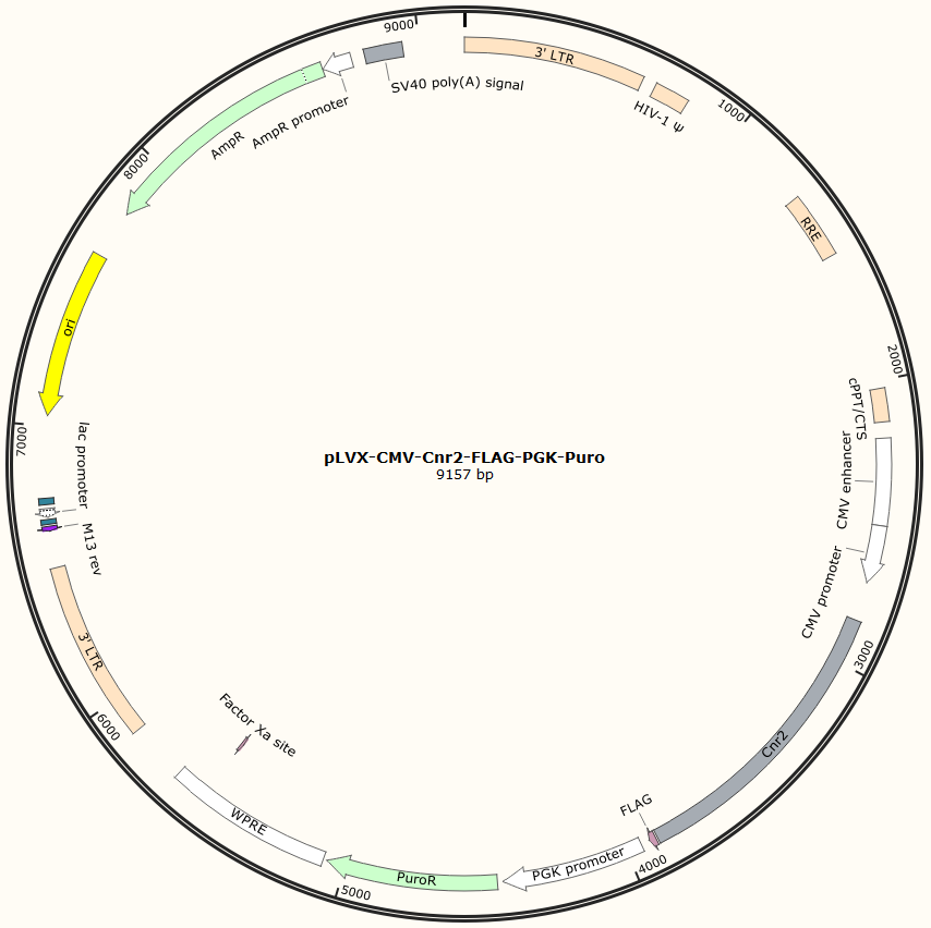 pLVX-CMV-Cnr2-FLAG-PGK-Puro是以基恩科生物自研慢病毒骨架载体pLVX-CMV-MCS-FLAG-PGK-Puro为骨架载体构建,过表达小鼠Cnr2基因,与载体PMD2.G和Pspax2配套进行慢病毒包装。