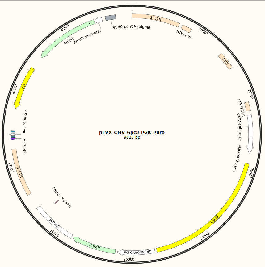 pLVX-CMV-Gpc3-PGK-Puro是以基恩科生物自研慢病毒骨架载体pLVX-CMV-MCS-PGK-Puro为骨架载体构建,过表达小鼠Gpc3基因,与载体PMD2.G和Pspax2配套进行慢病毒包装。
