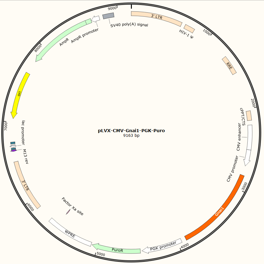 pLVX-CMV-Gnai1-PGK-Puro是以基恩科生物自研慢病毒骨架载体pLVX-CMV-MCS-PGK-Puro为骨架载体构建,过表达小鼠Gnai1基因,与载体PMD2.G和Pspax2配套进行慢病毒包装。