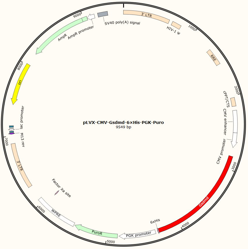 pLVX-CMV-Gsdmd-6×His-PGK-Puro是以基恩科生物自研慢病毒骨架载体pLVX-CMV-MCS-6×His-PGK-Puro为骨架载体构建,过表达小鼠Gsdmd基因,与载体PMD2.G和Pspax2配套进行慢病毒包装。