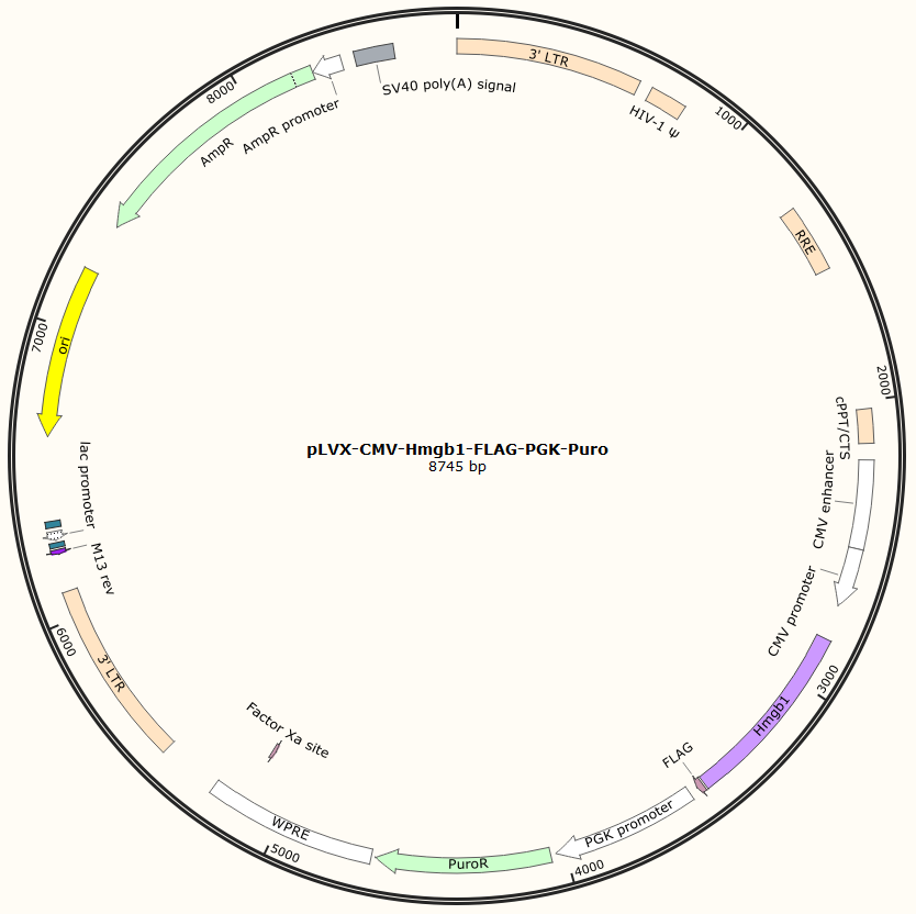 pLVX-CMV-Hmgb1-FLAG-PGK-Puro是以基恩科生物自研慢病毒骨架载体pLVX-CMV-MCS-FLAG-PGK-Puro为骨架载体构建,过表达小鼠MDM2基因,与载体PMD2.G和Pspax2配套进行慢病毒包装。