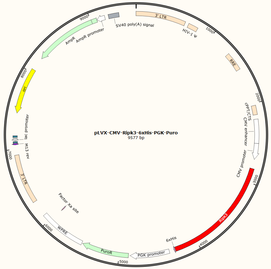 pLVX-CMV-Ripk3-6xHis-PGK-Puro是以基恩科生物自研慢病毒骨架载体pLVX-CMV-MCS-6xHis-PGK-Puro为骨架载体构建,过表达小鼠Ripk3基因,与载体PMD2.G和Pspax2配套进行慢病毒包装。