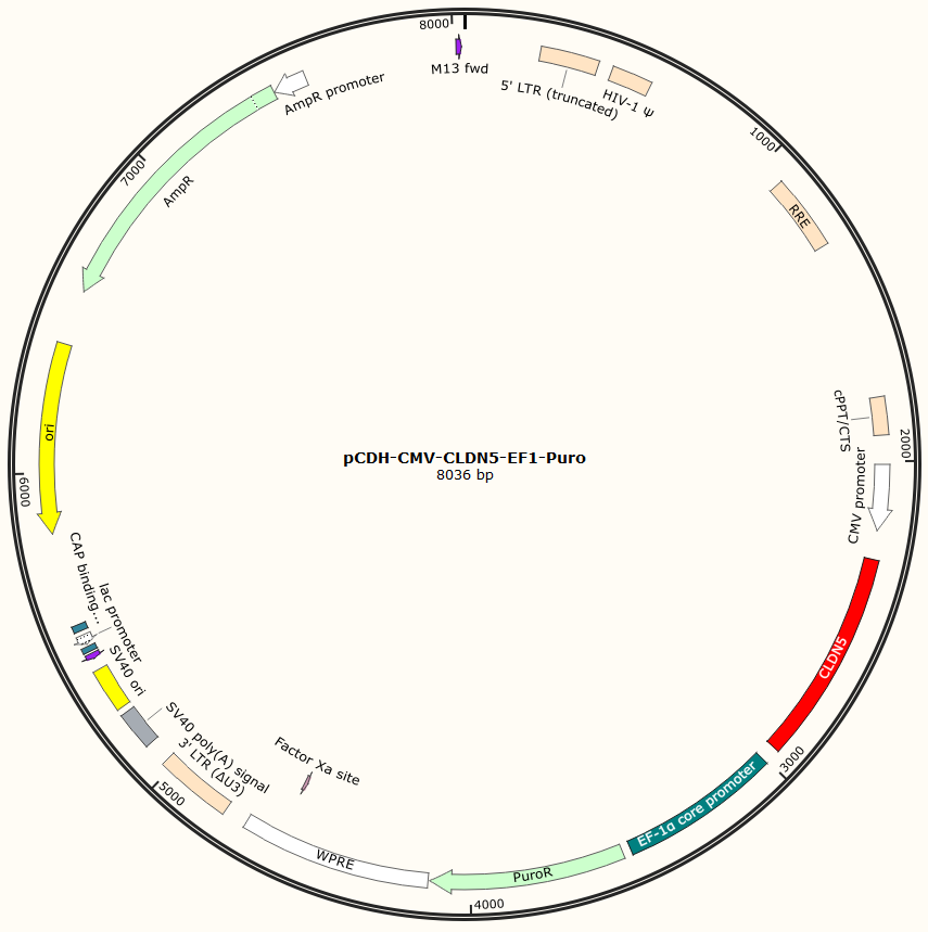 pCDH-CMV-CLDN5-EF1-Puro是以基恩科生物自研慢病毒骨架载体pCDH-CMV-MCS-EF1-Puro为骨架载体构建,过表达小鼠CLDN5基因,与载体PMD2.G和Pspax2配套进行慢病毒包装。