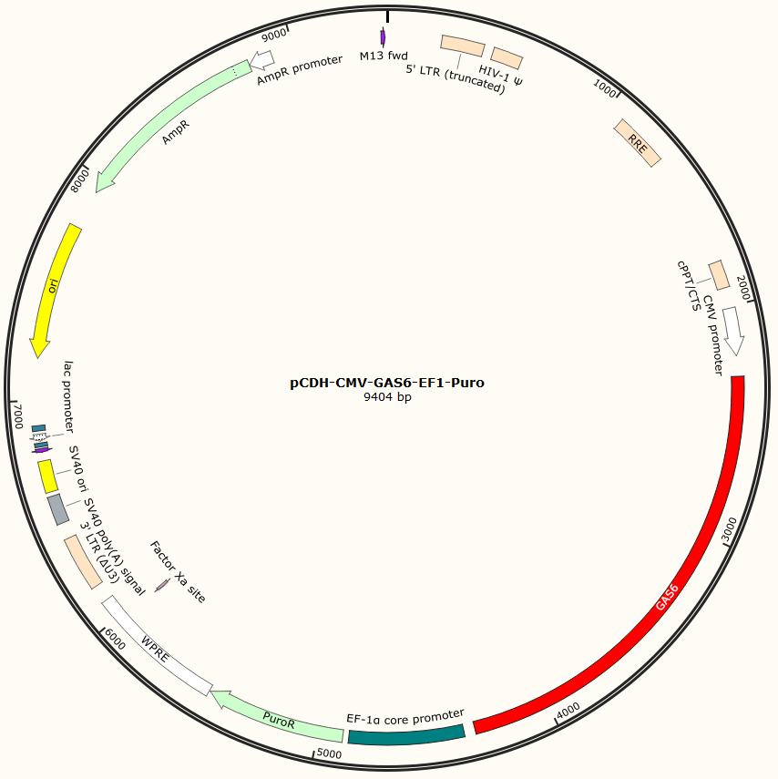 pCDH-CMV-GAS6-EF1-Puro是以基恩科生物自研慢病毒骨架载体pCDH-CMV-MCS-EF1-Puro为骨架载体构建,过表达小鼠GAS6基因,与载体PMD2.G和Pspax2配套进行慢病毒包装.。