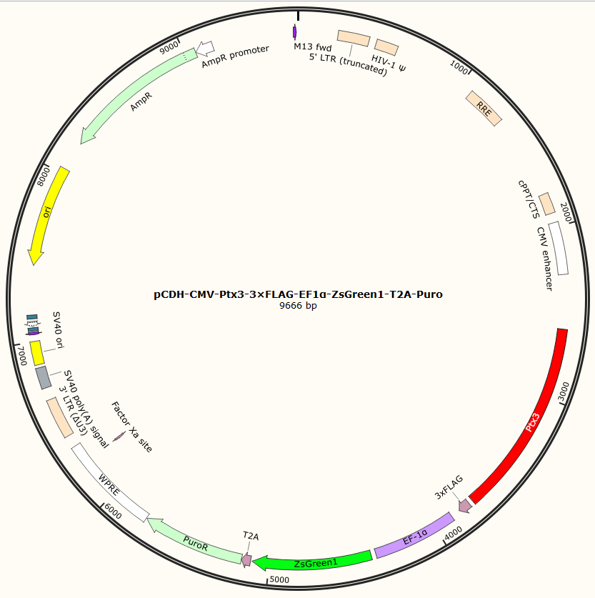 pCDH-CMV-Ptx3-3×FLAG-EF1α-ZsGreen1-T2A-Puro是以基恩科生物自研慢病毒骨架载体pCDH-CMV-MCS-3×FLAG-EF1α-ZsGreen1-T2A-Puro为骨架载体构建,过表达小鼠Ptx3基因,与载体PMD2.G和Pspax2配套进行慢病毒包装。