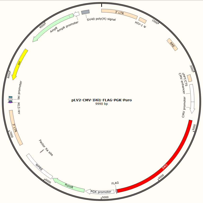 pLV2-CMV-Il4i1-FLAG-PGK-Puro是以基恩科生物自研慢病毒骨架载体pLV2-CMV-MCS-FLAG-PGK-Puro为骨架载体构建,过表达小鼠Il4i1基因,与载体PMD2.G和Pspax2配套进行慢病毒包装。
