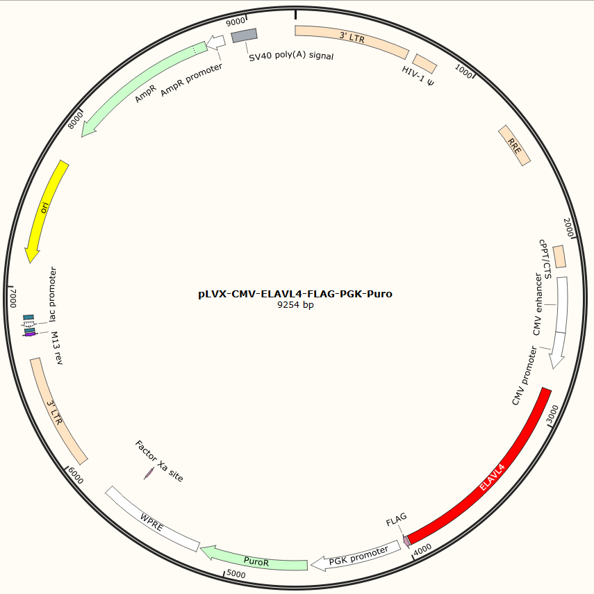 pLVX-CMV-ELAVL4-FLAG-PGK-Puro是以基恩科生物自研慢病毒骨架载体pLVX-CMV-MCS-FLAG-PGK-Puro为骨架载体构建,过表达小鼠ELAVL4基因,与载体PMD2.G和Pspax2配套进行慢病毒包装。