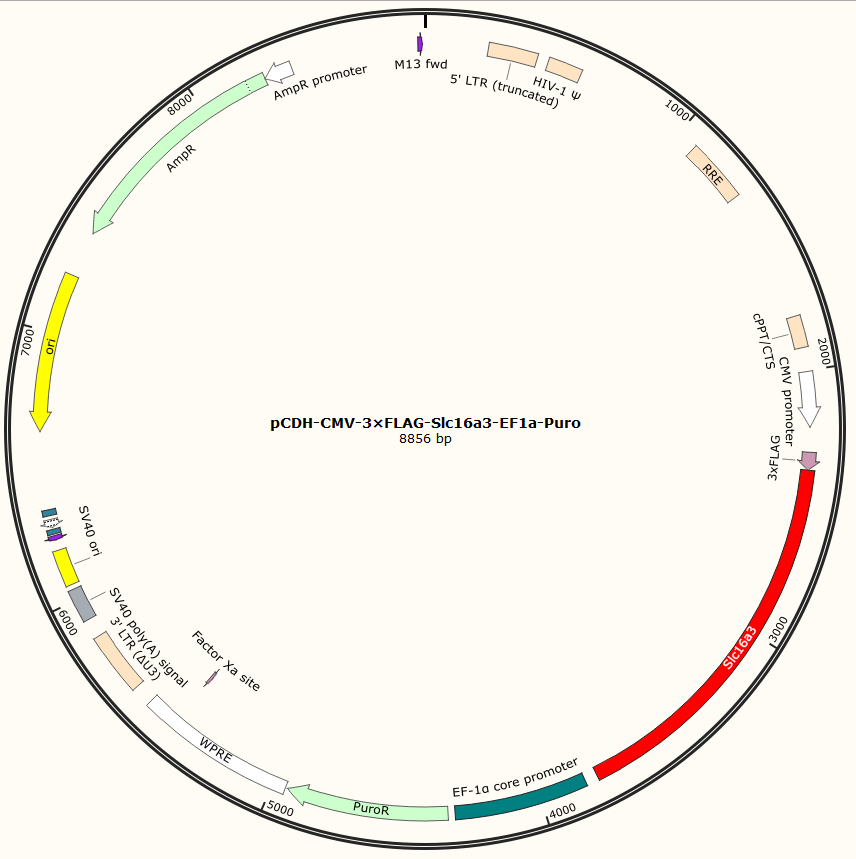 pCDH-CMV-3×FLAG-Slc16a3-EF1a-Puro是以基恩科生物自研慢病毒骨架载体pCDH-CMV-MCS-EF1-Puro为骨架载体构建,过表达小鼠Slc16a3基因,与载体PMD2.G和Pspax2配套进行慢病毒包装。