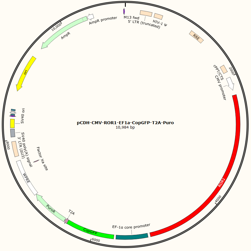 pCDH-CMV-ROR1-EF1a-CopGFP-T2A-Puro是以基恩科生物自研慢病毒骨架载体pCDH-CMV-MCS-EF1-Puro为骨架载体构建,过表达小鼠ROR1基因,与载体PMD2.G和Pspax2配套进行慢病毒包装。