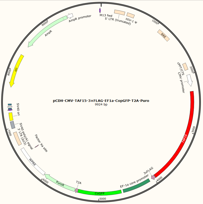 pCDH-CMV-TAF15-3×FLAG-EF1a-CopGFP-T2A-Puro是以基恩科生物自研慢病毒骨架载体pCDH-CMV-MCS-EF1-Puro为骨架载体构建,过表达小鼠TAF15基因,与载体PMD2.G和Pspax2配套进行慢病毒包装。