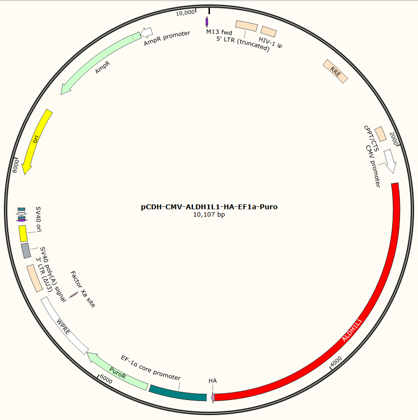 pCDH-CMV-ALDH1L1-HA-EF1a-Puro是以基恩科生物自研慢病毒骨架载体pCDH-CMV-MCS-EF1-Puro为骨架载体构建,过表达小鼠ALDH1L1基因,与载体PMD2.G和Pspax2配套进行慢病毒包装。