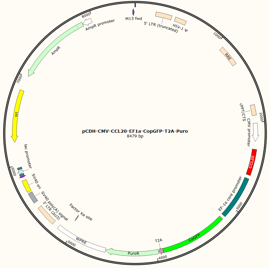 pCDH-CMV-CCL20-EF1a-CopGFP-T2A-Puro是以基恩科生物自研慢病毒骨架载体pCDH-CMV-MCS-EF1-Puro为骨架载体构建,过表达小鼠CCL20基因,与载体PMD2.G和Pspax2配套进行慢病毒包装。