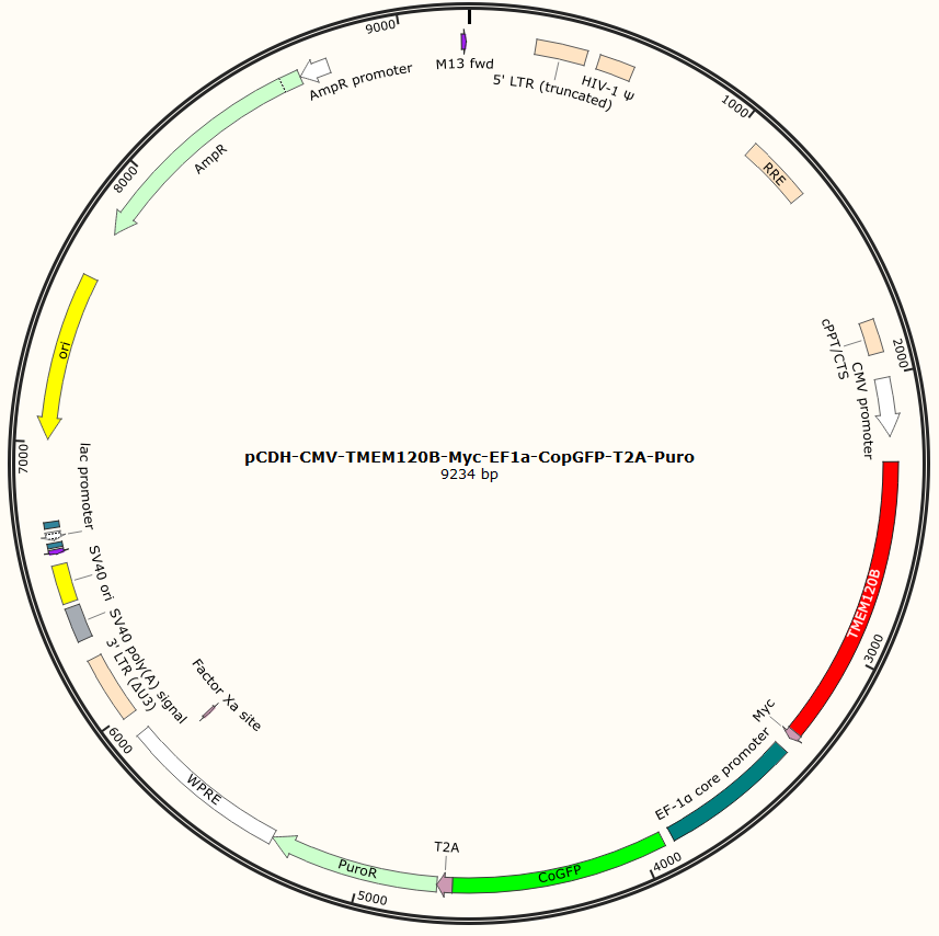 pCDH-CMV-TMEM120B-Myc-EF1a-CopGFP-T2A-Puro是以基恩科生物自研慢病毒骨架载体pCDH-CMV-MCS-EF1-Puro为骨架载体构建,过表达小鼠TMEM120B基因,与载体PMD2.G和Pspax2配套进行慢病毒包装。