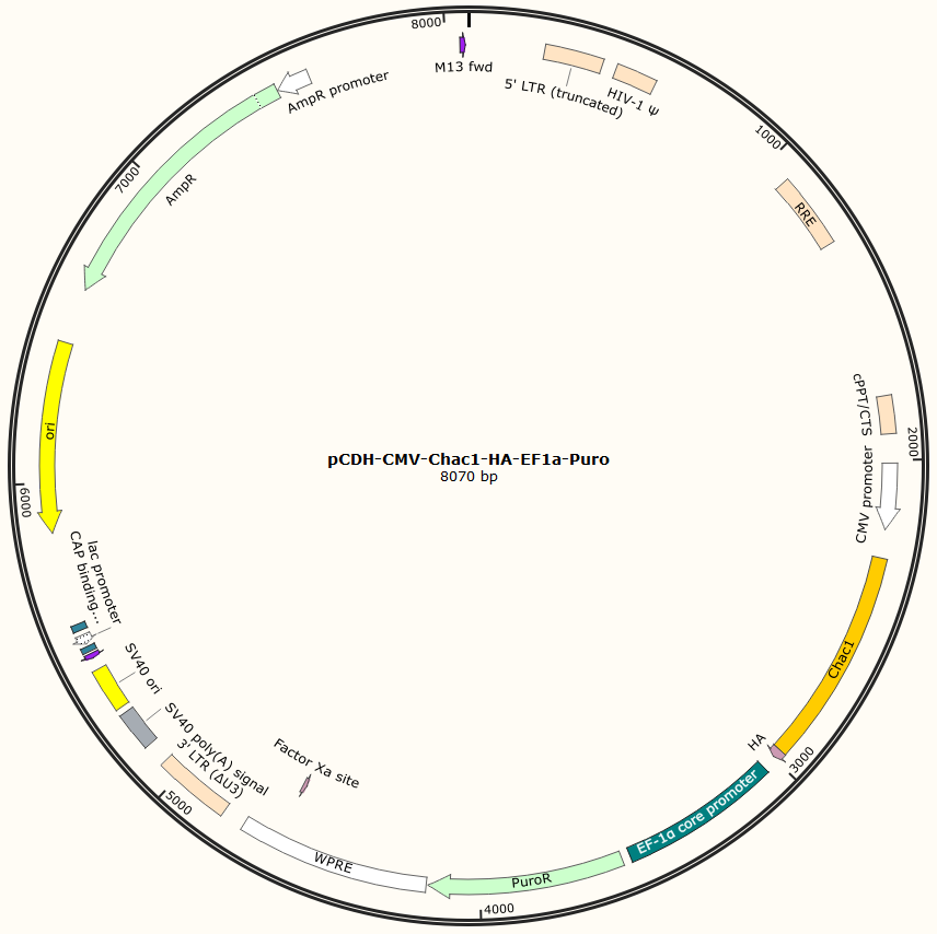 pCDH-CMV-Chac1-HA-EF1a-Puro是以基恩科生物自研慢病毒骨架载体pCDH-CMV-MCS-EF1-Puro为骨架载体构建,过表达小鼠Chac1基因,与载体PMD2.G和Pspax2配套进行慢病毒包装。