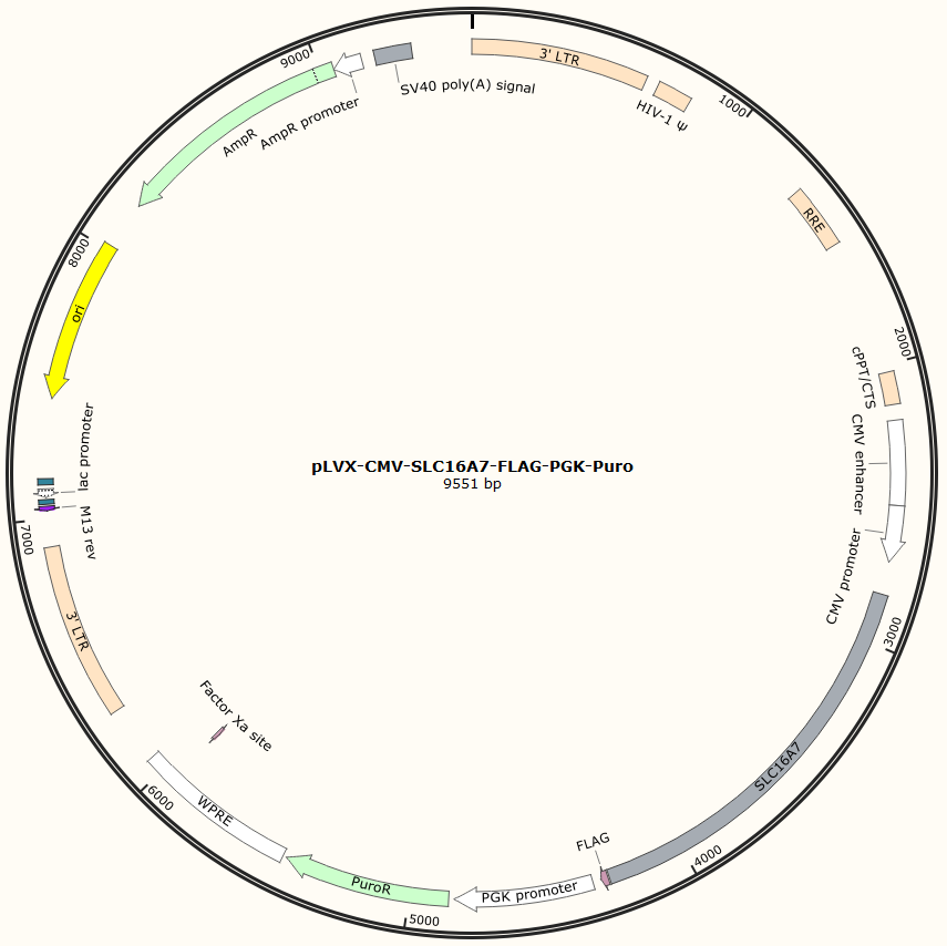 pLVX-CMV-SLC16A7-FLAG-PGK-Puro是以基恩科生物自研慢病毒骨架载体pLVX-CMV-MCS-FLAG-PGK-Puro为骨架载体构建,过表达小鼠SLC16A7基因,与载体PMD2.G和Pspax2配套进行慢病毒包装。