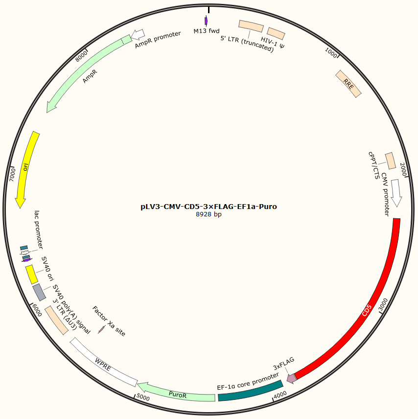 | GC020400941 | pLV3-CMV-CD5-3×FLAG-EF1a-Puro | 2μg | CD5基因过表达 | 800.00 | 2-3天 |