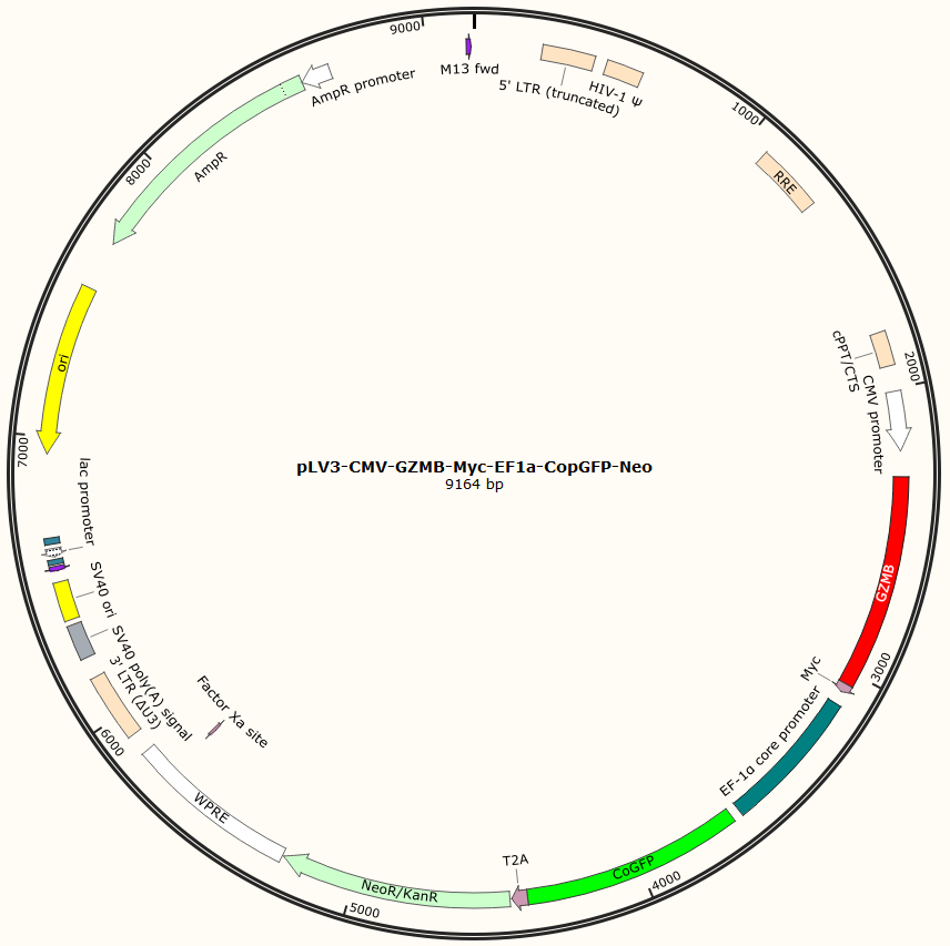 pLV3-CMV-GZMB-Myc-EF1a-CopGFP-Neo是以基恩科生物自研慢病毒骨架载体pLV3-CMV-MCS-Myc-EF1a-CopGFP-Neo为骨架载体构建,过表达小鼠GZMB基因,与载体PMD2.G和Pspax2配套进行慢病毒包装。
