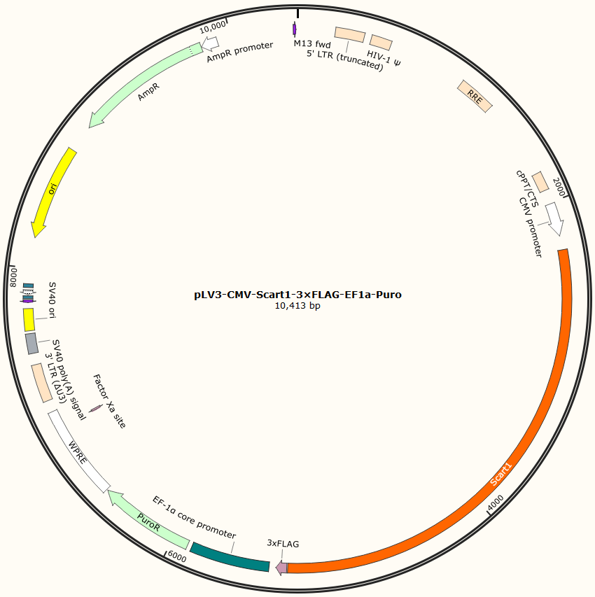 pLV3-CMV-Scart1-3×FLAG-EF1a-Puro是以基恩科生物自研慢病毒骨架载体pLV3-CMV-MCS-3×FLAG-EF1a-Puro为骨架载体构建,过表达小鼠Scart1基因,与载体PMD2.G和Pspax2配套进行慢病毒包装。