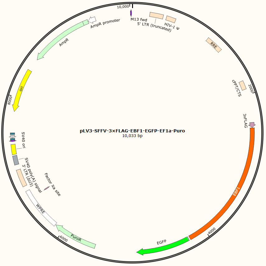 pLV3-SFFV-3×FLAG-EBF1-EGFP-EF1a-Puro是以基恩科生物自研慢病毒骨架载体pLV3-SFFV-3×FLAG-MCS-EGFP-EF1a-Puro为骨架载体构建,过表达小鼠EBF1基因,与载体PMD2.G和Pspax2配套进行慢病毒包装。