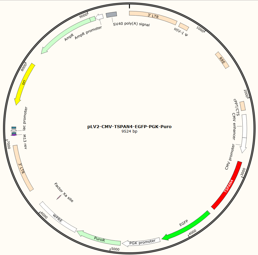 pLV2-CMV-TSPAN4-EGFP-PGK-Puro是以基恩科生物自研慢病毒骨架载体pLV2-CMV-MCS-EGFP-PGK-Puro为骨架载体构建,过表达小鼠TSPAN4基因,与载体PMD2.G和Pspax2配套进行慢病毒包装。