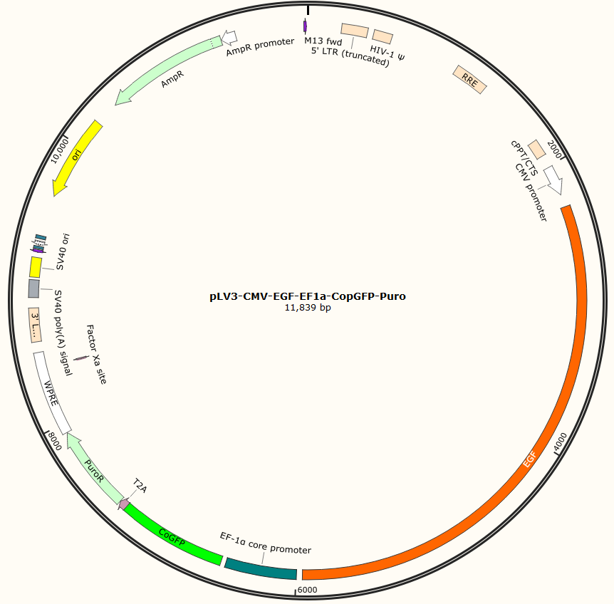 pLV3-CMV-EGF-EF1a-CopGFP-Puro是以基恩科生物自研慢病毒骨架载体pLV3-CMV-MCS-EF1a-CopGFP-Puro为骨架载体构建,过表达小鼠EGF基因,与载体PMD2.G和Pspax2配套进行慢病毒包装。